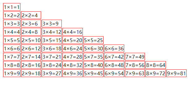 function Cfb(x){this.init(x);}//初始化方法,当咱们构造函数上的方法比较多的时候//可以先把方法在它里面调用然后直接在构造函数内部调用init方法即可//归纳Cfb.prototype.init = function(x){this.calc(x);}Cfb.prototype.calc = function(x){let str = '<table>';for(let i=1; i<=x; i++){str += '<tr>';for(let j=1; j<=i; j++){str += `<td style='border:1px solid red'>${j}×${i}=${j*i}</td>`;}str += '</tr>';}str += '</table>';document.write(str)}
