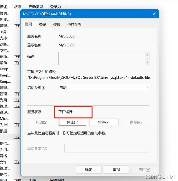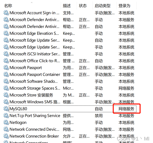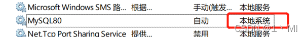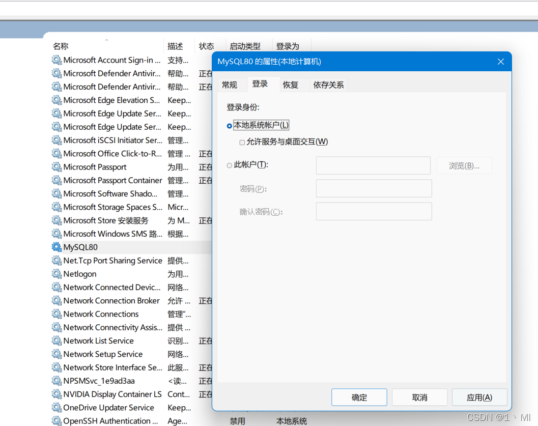 mysql80右键属性->登录 登陆身份修改为本地账户,应用。