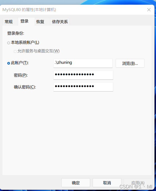 属性mysql80属性设置中,登陆选择此账户,然后浏览,输入你的当前账号的登录名,和密码,就可以一网络方式登陆了。