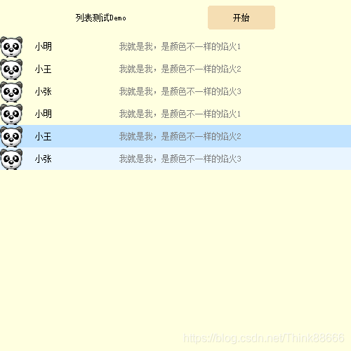 public:virtual LPCTSTR GetWindowClassName() const { return _T("listDemo1"); }virtual CDuiString GetSkinFile() { return _T("listdemo.xml"); }virtual CDuiString GetSkinFolder() { return _T(""); }//virtual LRESULT HandleMessage(UINT uMsg, WPARAM wParam, LPARAM lParam)//{// return WindowImplBase::HandleMessage(uMsg, wParam, lParam);//}virtual void Notify(TNotifyUI& msg){if (msg.sType == DUI_MSGTYPE_CLICK && msg.pSender->GetName() == _T("btnstart")){//点按钮往列表插入数据CMyListUI2* pMyList2 = static_cast<CMyListUI2*>(m_PaintManager.FindControl(_T("list1")));if (pMyList2){MyItem2 itemdata1;itemdata1.strPic = _T("default.png");itemdata1.strNiceName = _T("小明");itemdata1.strDes = _T("我就是我,是颜色不一样的焰火1");pMyList2->AddItem(itemdata1);MyItem2 itemdata2;itemdata2.strPic = _T("default.png");itemdata2.strNiceName = _T("小王");itemdata2.strDes = _T("我就是我,是颜色不一样的焰火2");pMyList2->AddItem(itemdata2);MyItem2 itemdata3;itemdata3.strPic = _T("default.png");itemdata3.strNiceName = _T("小张");itemdata3.strDes = _T("我就是我,是颜色不一样的焰火3");pMyList2->AddItem(itemdata3);}return;}}virtual CControlUI* CreateControl(LPCTSTR pstrClass){if (_tcsicmp(pstrClass, _T("MyList2")) == 0){return new CMyListUI2(m_PaintManager);}elsereturn NULL;}