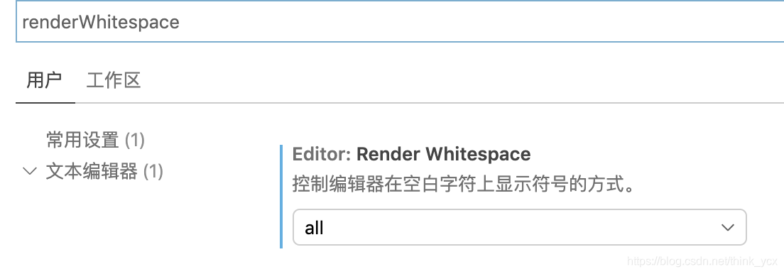 2. 在搜索框中输入renderWhitespace,选择all,即可显示空格