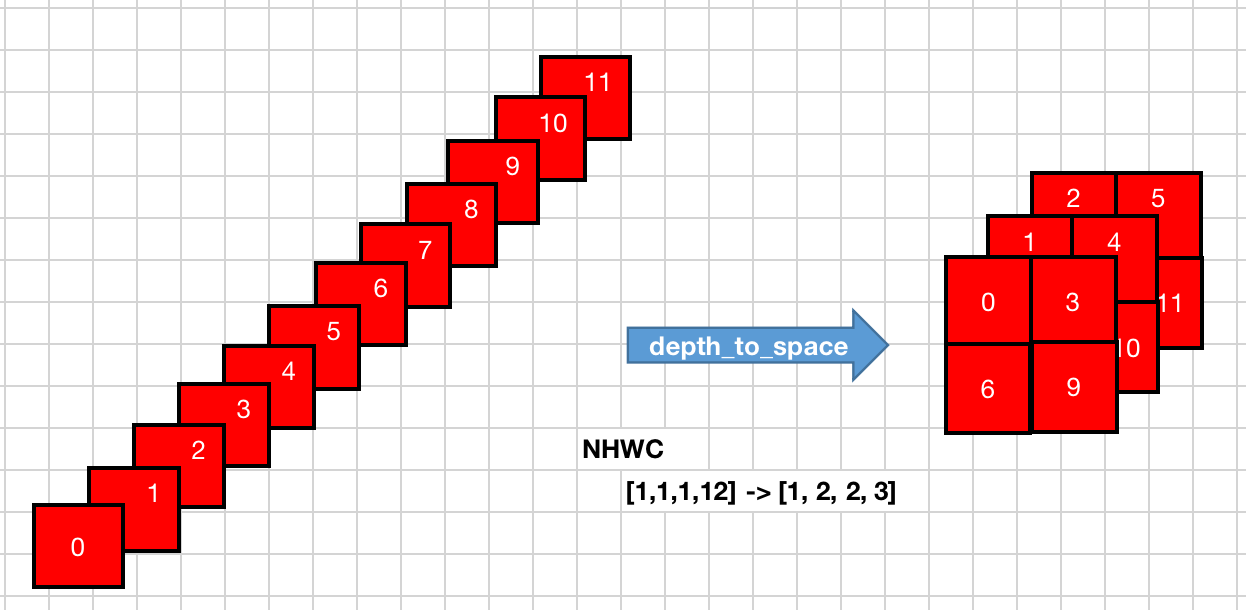 直观上看,上面程序的[1,1,1,12] -> [1, 2, 2, 3]的depth_to_space操作如下: