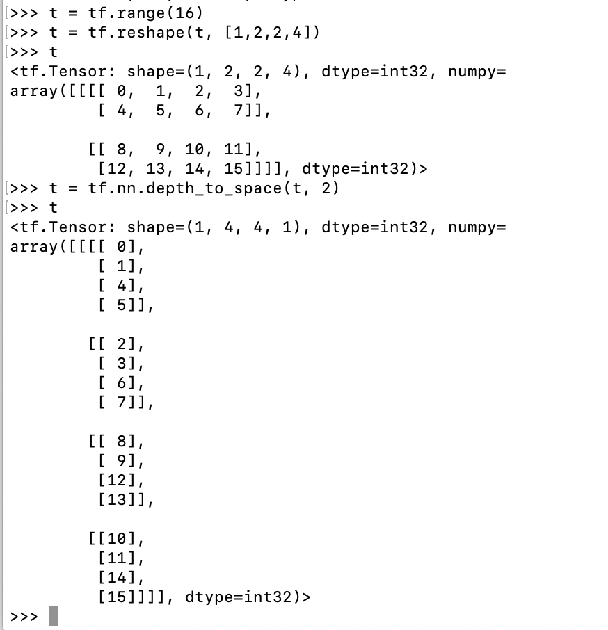 depth_to_space执行时维度的变化很容易理解:Width是 input_width x block_size;Height是 input_height x block_size;Depth是input_depth / (block_size * block_size)。