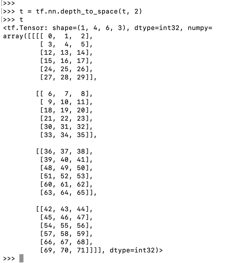 最后的Tensor的shape也就是[in_batch, in_height * block_size, in_width * block_size, in_channel / (block_size*block_size)]