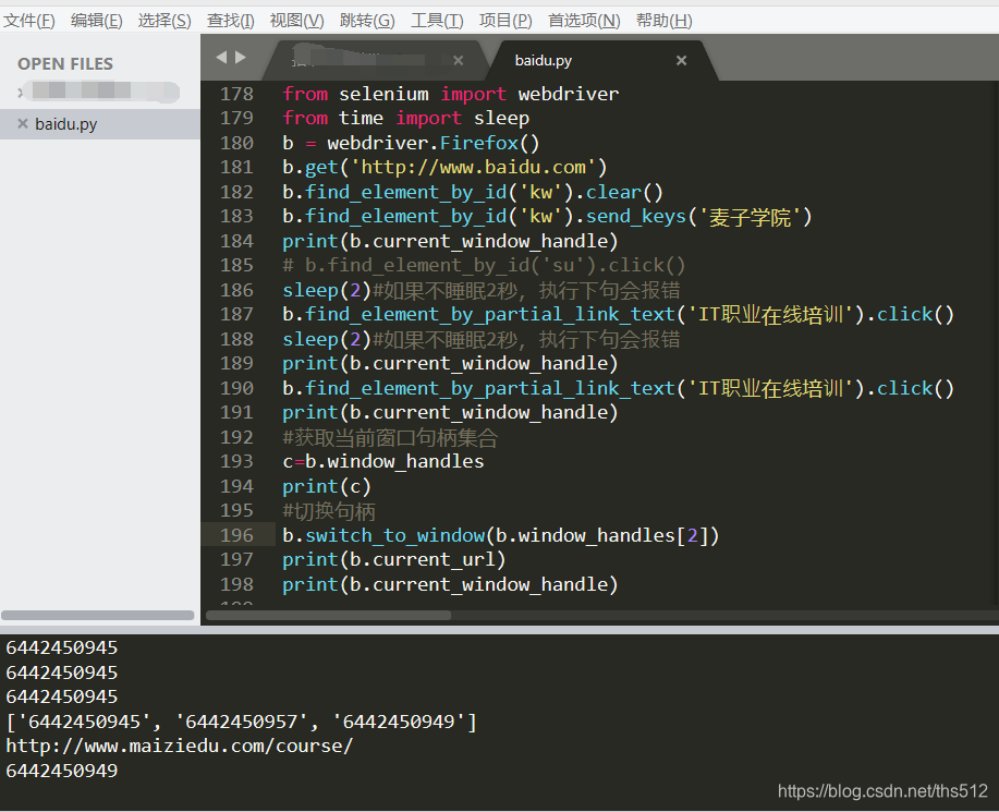 selenium执行时并不会自动切换到新开的页签或者窗口上,还会停留在之前的窗口中,所以两次打印的句柄都一样。新开窗口后必须通过脚本来进行句柄切换,才能正确操作相应窗口中的元素,例如:
