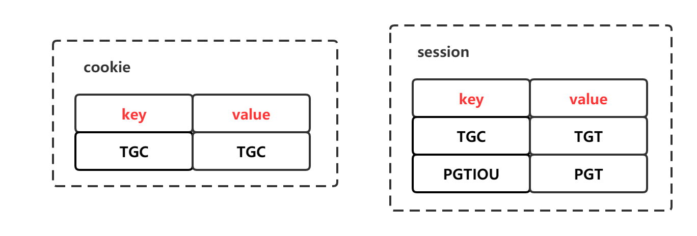 CAS Server 生成TGT放入自己的 Session 中,而 TGC 就是这个 Session 的唯一标识(SessionId),以 Cookie 形式放到浏览器端。