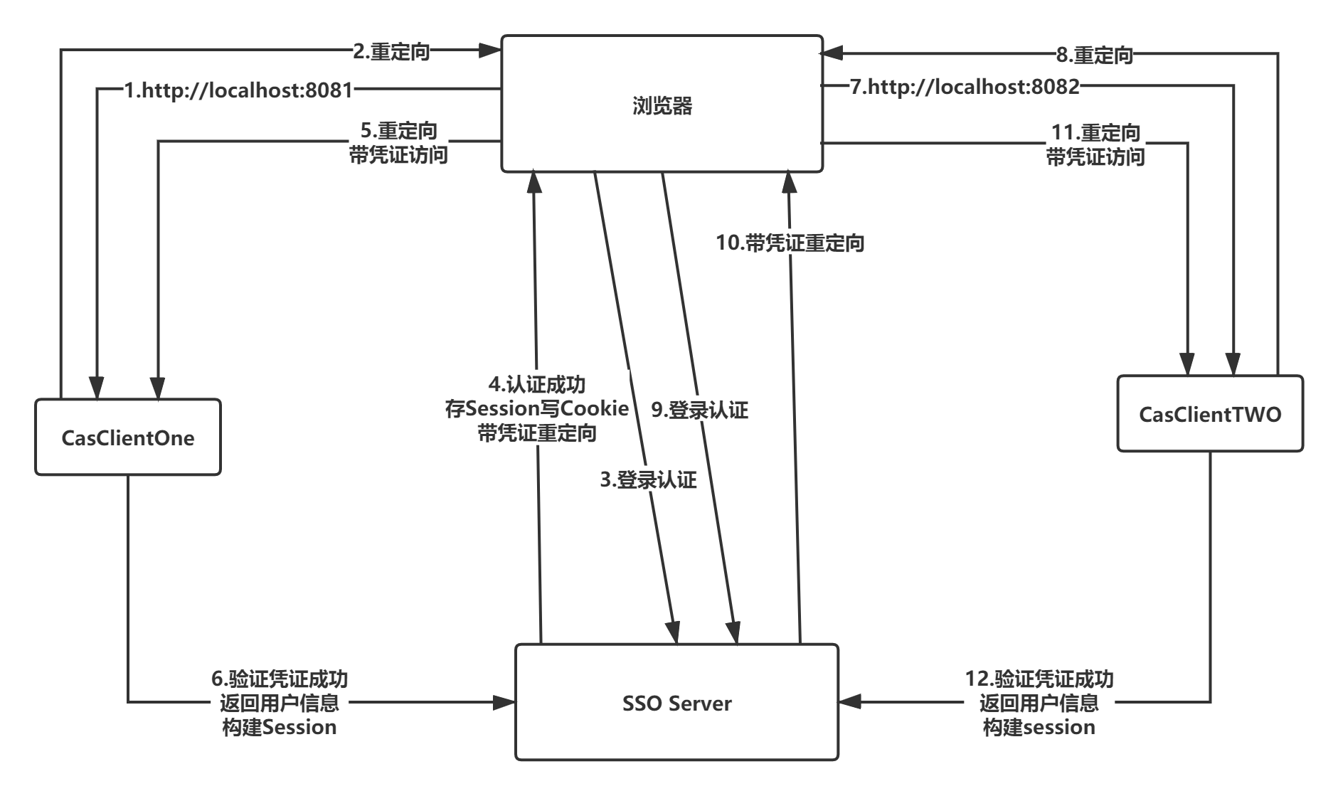 - CasClientTWO根据票据向 SSO 服务器发送请求,票据验证通过后,CasClientTWO知道用户已经在SSO服务器登录了,于是生成 session,向浏览器写入CasClientTWO的 cookie。