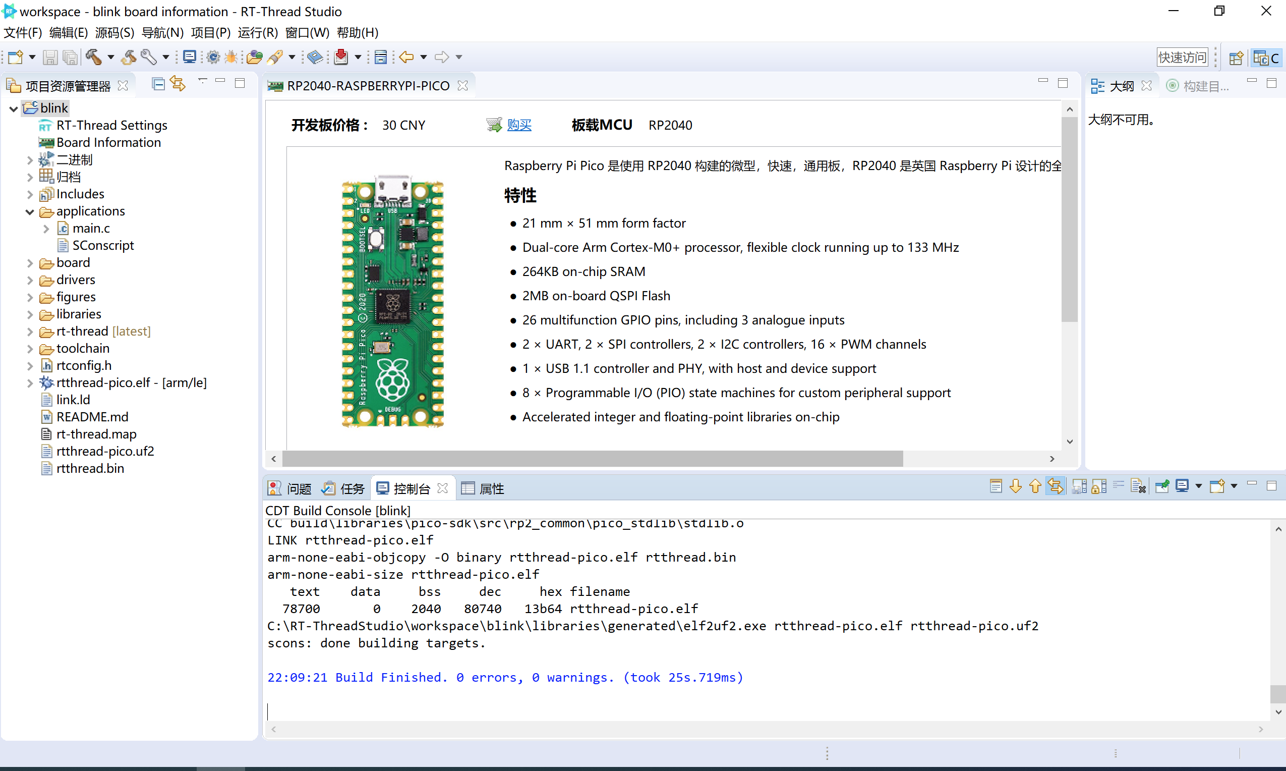 我们看到已经有了rtthread-pico.elf和rtthread-pico.uf2的固件了。
