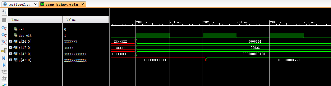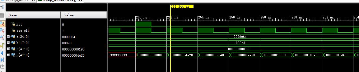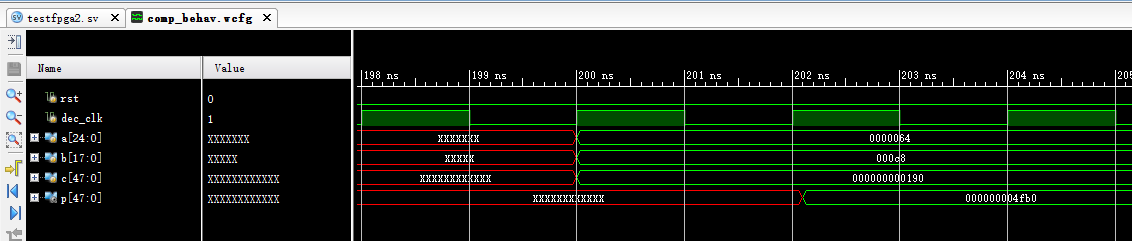 下面是之前我调试时的打印,把.USE_DPORT误设为TRUE时,结果为0,可以看到mult_o这一步为0了,再跟着代码拉几根信号到波形窗口,就发现问题了,