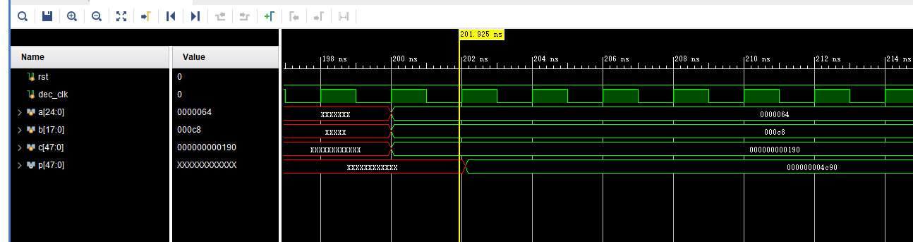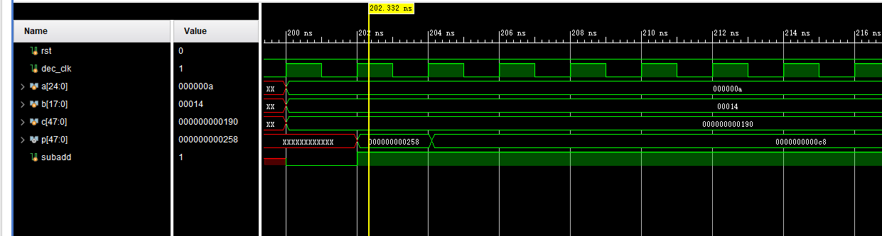 wire signed [47:0] pc;initial beginrst = 0;#200 a = 100;#0 b = 200;#0 d = 45;#0 c = 400;#50 rst = 1;#1 rst = 0;#100 $display("p %d",p);