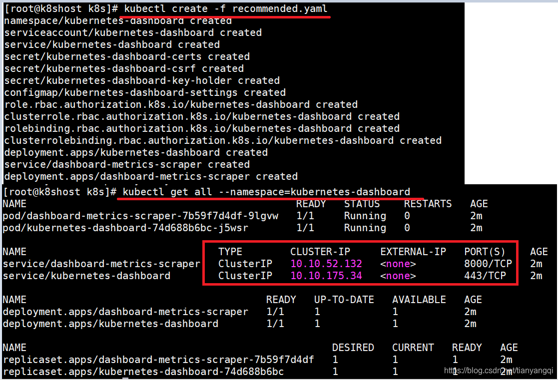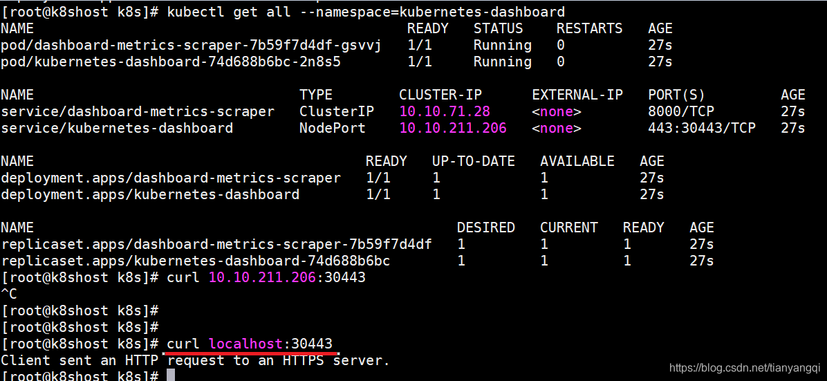 kubectl get all --namespace=kubernetes-dashboard //查看kubernetes-dashboard命名空间下的所有资源