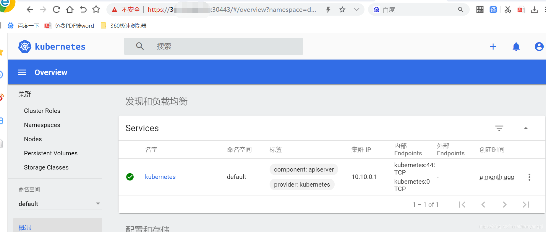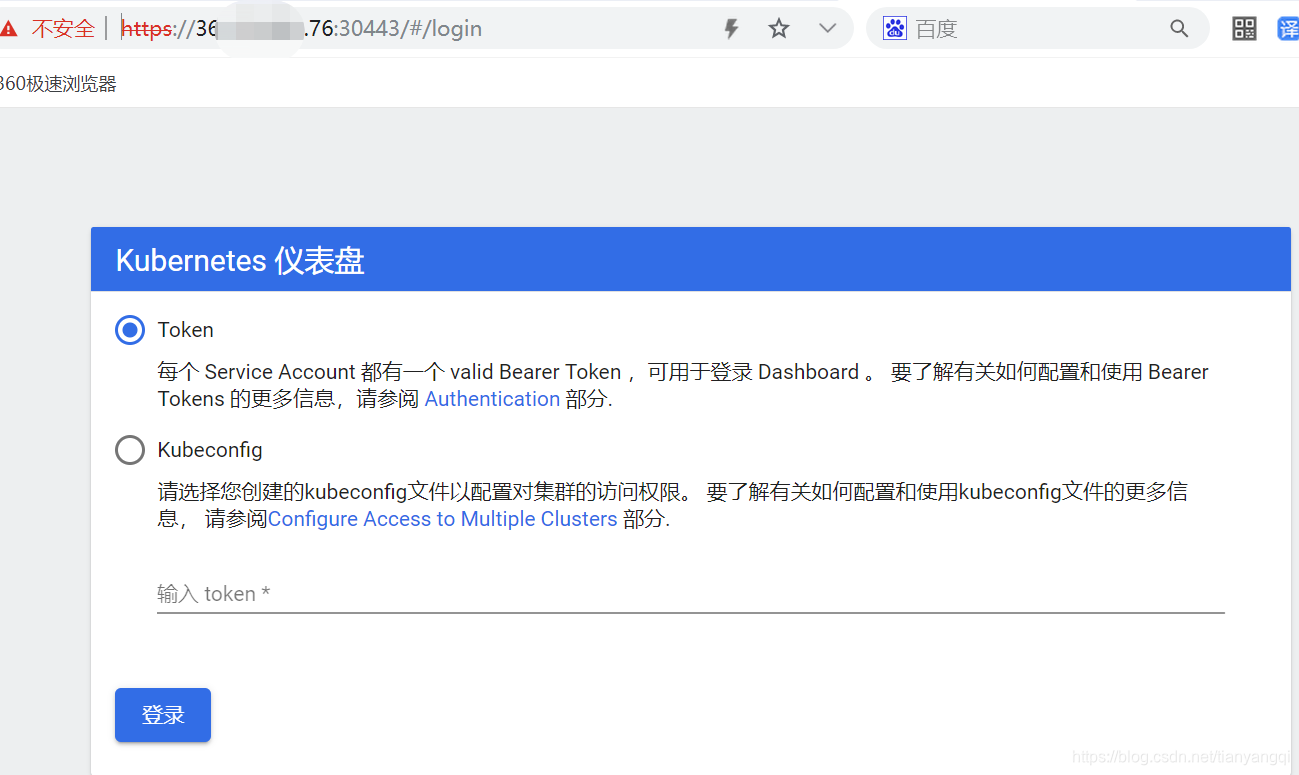 再次通过浏览器访问,https://[Node的IP地址]:[端口],不过还是不能正常访问dashboard页面的,因为https是需要证书的。