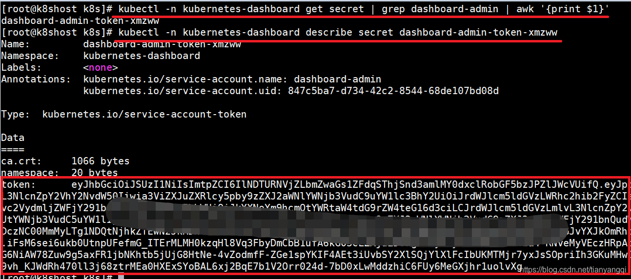 kubectl -n kubernetes-dashboard describe secret dashboard-admin-token-xmzww //查看此secret(令牌)的详细信息,找到token加密串