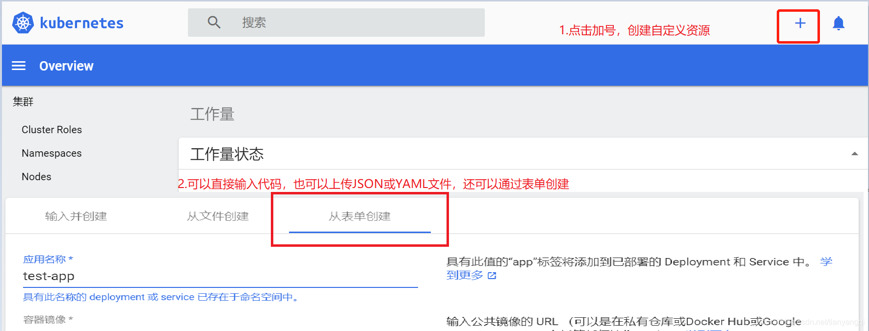 步骤三:通过dashboard页面来管理集群。有了这个页面,再也不用为哪些难懂的命令操心了,熟悉的“点点点”神操作又回来啦。其实有了这个页面,相当于我们搭建了一个简单的云平台了,如果有“客户”想要开云资源,只要等到到这个页面,就可以满足客户需求了,至少IaaS资源可以正常开通。