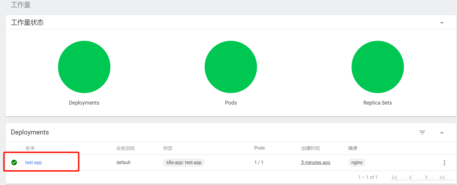成功部署了一个Deployment资源,里面只有一个Pod,名字叫test-app,此Pod中部署了一个docker容器,镜像为Nginx。