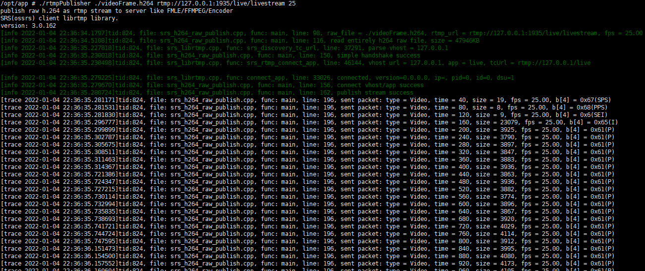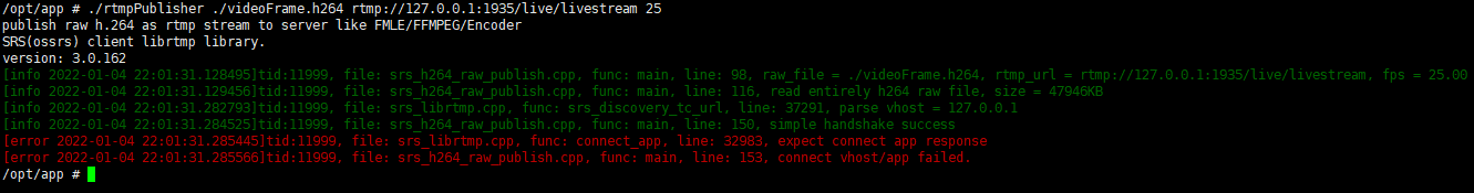 对srs_librtmp不熟悉,不知道这个是什么错误引起的,网上搜索一番也未能找到答案。最后终于找到原因了,因为我们调用的命令是:./rtmpPublisher ./videoFrame.h264 rtmp://127.0.0.1:1935/live/livestream 25;我们的配置里相应的也要有配置,其配置如下:
