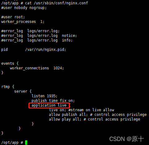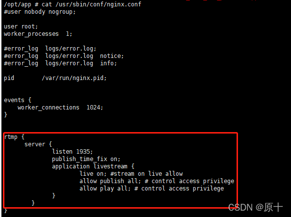 已经在读取h264文件进行推送了。配置文件一定要修改对,可以用nginx -t 进行测试,这样可以测试nginx配置文件是否存在语法错误,或是无法识别的module,如果nginx不支持rtmp模块,而在nginx.conf里添加了rtmp模块的配置,则会报错无法识别等信息。配置如下: