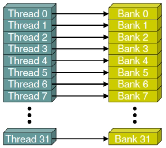 为了获得较高的内存带宽,共享存储器被划分为多个大小相等的存储器模块,称为bank,可以被同时访问。