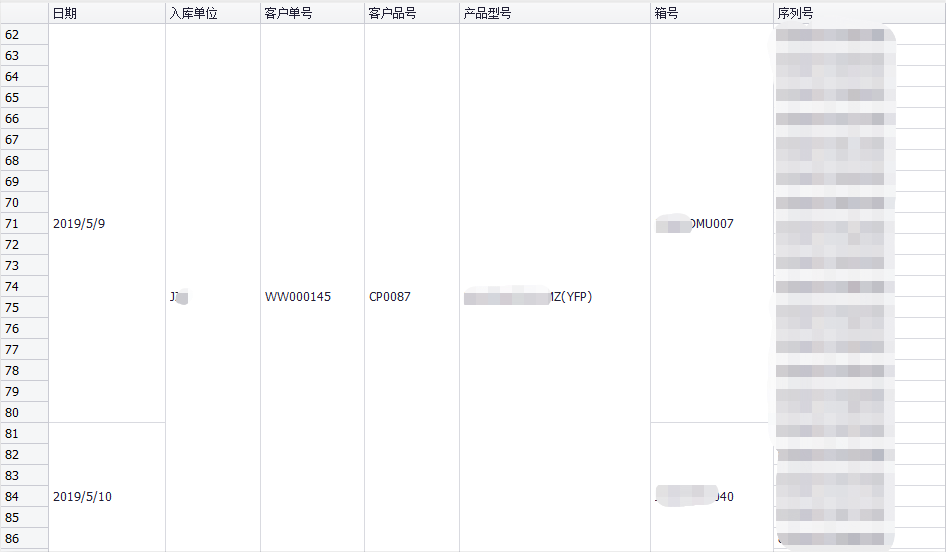 表格中的入库单位,客户单号,客户品号,产品型号都是同样的值,需要展示的结果是根据箱号进行合并单元格,但是实际却是所有上下列只要数值相同,就被合并了,达不到要求