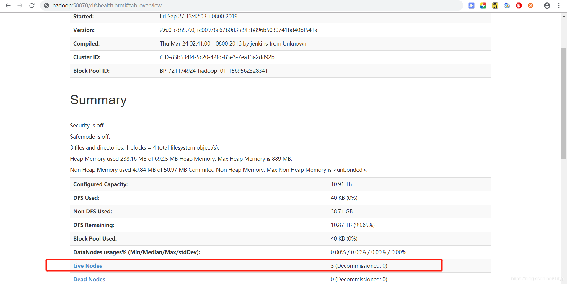 看到所有节点已经正常启动了,我们接下来访问一下它的界面http://hadoop101:50070