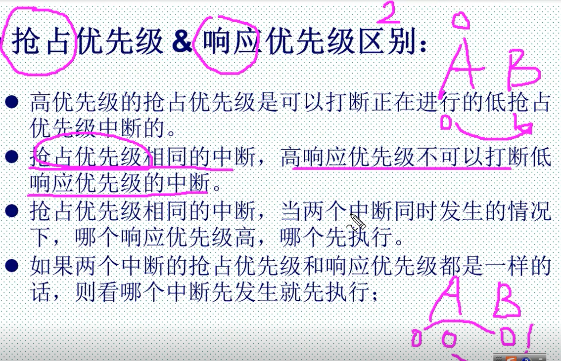 情况二,第三点:若是同时发生中断的话,就由哪个响应优先级高,哪个先执行。