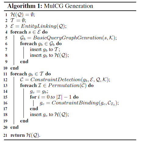 - 第11,12行:对于每一个basic query graph,结合问句、知识库、实体得到一系列约束