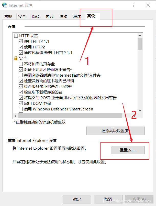 2.在弹出的选项卡中,选择“高级”选项,点击重置