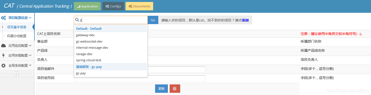 前面"配置domain"也说过,当项目刚开始接入有监控数据上传到CAT后,会在CAT“项目基本信息”配置页面上看到该名称的应用。
