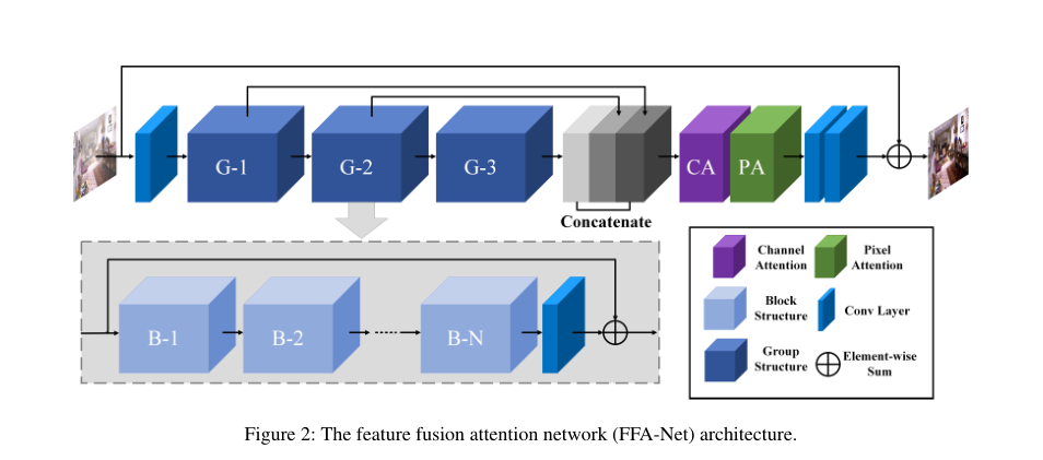 我们提出了一个由局部剩余学习和特征注意(FA)组成的基本块,局部剩余学习允许通过多跳连接绕过薄雾区域和低频信息,特征注意(FA)进一步提高了FFA网络的容量。