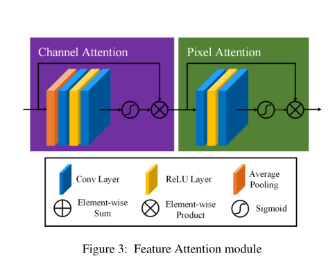我们提出了一种新的特征注意(FA)模块,它结合了通道注意和像素注意机制。该模块在处理不同类型的信息时提供了额外的灵活性,更加关注浓雾的像素和更重要的信道信息。