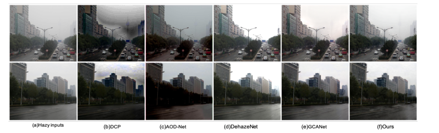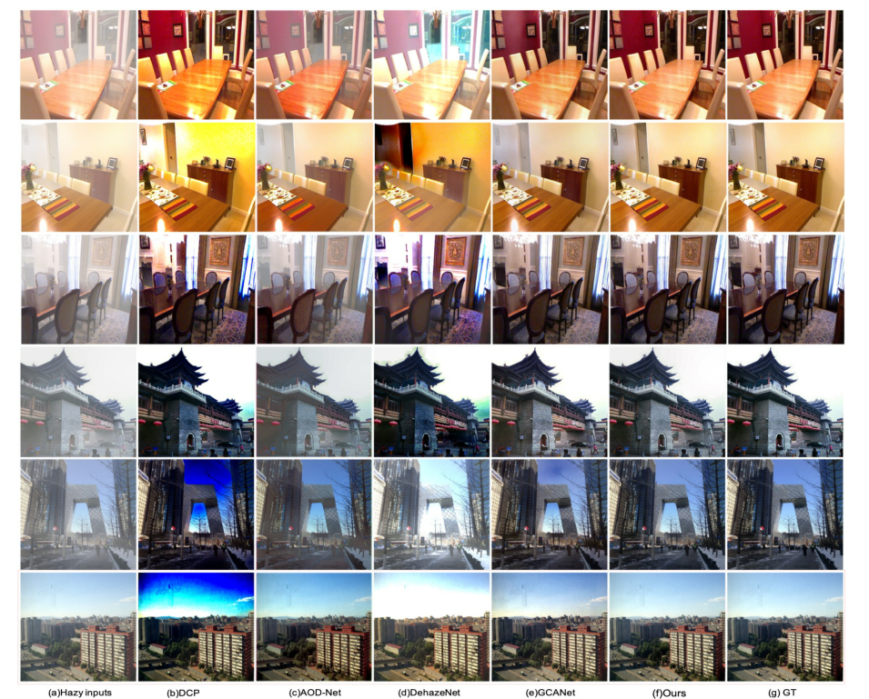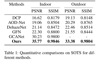 在这一部分中,我们将从定量和定性两个方面比较FFA网络和以往最先进的图像去叠算法。比较了DCP、AOD网、DehazeNet、GCANet四种最新的去叠算法,比较结果见表1。
