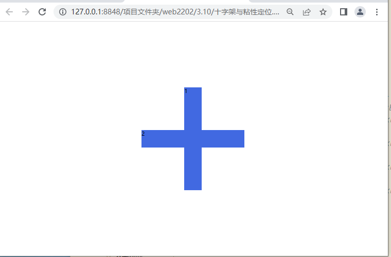 <head><meta charset="utf-8"><title>十字架居中</title><style type="text/css">.red {width: 50px;height: 300px;background-color: royalblue;}.blue {width: 300px;height: 50px;background-color: royalblue;top: 125px;}.red,.blue {position: absolute;left: 0;right: 0;top: 0;bottom: 0;margin: auto;}</style>