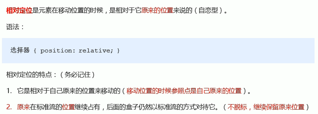 1.他是相对于自己原来的位置来移动的(移动位置的时候参照点是自己原来的位置)2.原来在标准流的位置继续占有,后面的盒子仍然以标准流的方式对待他,(不脱标,继续保留原来位置)