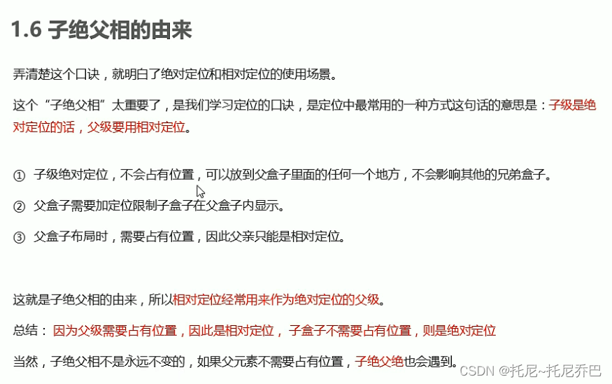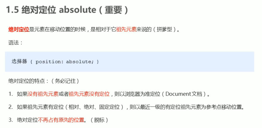 1.子级绝对定位,不会占位置,可以放到父盒子里面的任何一个地方,不会影响其他的兄弟盒子