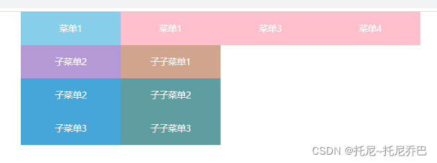 <html><head><meta charset="utf-8"><title></title><style type="text/css">.bj {background-color: pink;width: 720px;height: 60px;margin: 0 auto;}* {padding: 0;margin: 0;}ul {list-style: none;}a {text-decoration: none;color: #FFFFFF;}.bj li {text-align: center;}.bj>li:hover {background-color: #87CEEB;}.bj>li {float: left;line-height: 60px;width: 180px;}.bj .bj1 {background-color: #46a6d9;display: none;}.bj .bj1>li:hover {background-color: #b599d5;}.bj li:hover .bj1 {display: block;}.bj li .bj2 {background-color: cadetblue;}.bj li .bj1 {position: relative;}.bj .bj1 .bj2 {position: absolute;left: 180px;top: 0;width: 180px;height: 180px;display: none;}.bj .bj1 .bj2 li:hover {background-color: #d1a48d;}.bj .bj1 li:hover .bj2 {display: block;}</style></head><body><ul class="bj"><li><a href="#">菜单1</a><ul class="bj1"><li><a href="#">子菜单2</a><ul class="bj2"><li><a href="#">子子菜单1</a></li><li><a href="#">子子菜单2</a></li><li><a href="#">子子菜单3</a></li></ul></li><li><a href="#">子菜单2</a></li><li><a href="#">子菜单3</a></li></ul></li><li><a href="#">菜单1</a></li><li><a href="#">菜单3</a></li><li><a href="#">菜单4</a></li></ul></body>