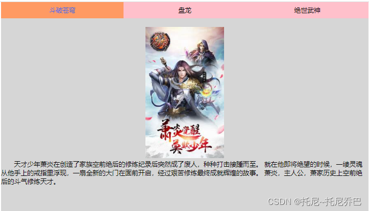 <html><head><meta charset="utf-8"><title></title><style type="text/css">* {padding: 0;margin: 0;}.dahezi {width: 900px;height: 40px;background-color: pink;margin: 0 auto;position: relative;}.dahezi input+label {float: left;width: 33.333%;text-align: center;line-height: 40px;background-color: pink;}.dahezi .box {width: 900px;height: 600px;background-color: #D6D6D6;}.dahezi .box p,.dahezi .box p,.dahezi .box p {text-indent: 2em;}.dahezi .box .tu1,.dahezi .box .tu2,.dahezi .box .tu3 {text-align: center;}.dahezi .box {position: absolute;left: 0;top: 40px;}input {display: none;}.dahezi input:checked+label {color: royalblue;background-color: #FF9A63;}.dahezi input+label+.box {display: none;}.dahezi input:checked+label+.box {display: block;}</style></head><body><div class="dahezi"><input type="radio" name="dx" id="dx1" checked /><label for="dx1">斗破苍穹</label><div class="box"><br><div class="tu1"><img src="images/doupocangqong.jpg"></div><p>天才少年萧炎在创造了家族空前绝后的修炼纪录后突然成了废人,种种打击接踵而至。 就在他即将绝望的时候,一缕灵魂从他手上的戒指里浮现,一扇全新的大门在面前开启,经过艰苦修炼最终成就辉煌的故事。萧炎,主人公,萧家历史上空前绝后的斗气修炼天才。</p></div><input type="radio" name="dx" id="dx2" /><label for="dx2">盘龙</label><div class="box"><br><div class="tu2"><img src="images/panlong.jpg"></div><p>林雷无意中从祖宅拣到一枚神奇的戒指,而后踏上了梦幻之旅的故事。 楼房大小的血睛鬃毛狮,力大无穷的紫睛金毛猿,毁天灭地的九头蛇皇,携带着毁灭雷电的恐怖雷龙,这里无奇不有,这是一个广博的魔幻世界。</p></div><input type="radio" name="dx" id="dx3" /><label for="dx3">绝世武神</label><div class="box"><br><div class="tu3"><img src="images/jueshiwushen.jpg"></div><p>这是一个恃强凌弱的世界,人们以武道修为来定等级、论高低。男主林枫因为一场车祸,穿越到了这个本不强大的林家大少爷身上。在这里,只有强者有权利生存下去,即使是同族同门之人也是如此。而他这一世怎还会继续任人宰割。</p></div></div></body>