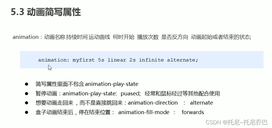 /*鼠标经过div 让这个div 停止动画,鼠标离开就继续动画 此属性值不能一起缩写*/animation-play-state: paused;