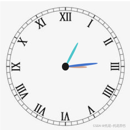 <html><head><meta charset="utf-8"><title>钟表</title><style type="text/css">@keyframes a{from{transform: rotate(0deg);}to{transform: rotate(360deg);}}.box1 {width: 10px;height: 100px;background-color: #D1A48D;top: -100px;animation: a 43200s steps(60) infinite ;}.box2 {width: 10px;height: 125px;background-color: #4dc5cb;top: -124px;animation: a 3600s steps(60) infinite ;}.box3 {width: 10px;height: 150px;background-color: #4373cb;top: -150px;animation: a 60s steps(60) infinite ;}.box1,.box2,.box3,.box img {position: absolute;border-radius: 50%;left: 0;right: 0;bottom: 0;margin: auto;transform-origin: bottom center;}.box img {top: 0;}.box {background-image: url(img/sz.jpg);background-size: 600px;width: 600px;height: 600px;margin: 0 auto;position: relative;}</style></head><body><div class="box"><div class="box1"></div><div class="box2"></div><div class="box3"></div><img src="img/triangles.png" ></div></body>