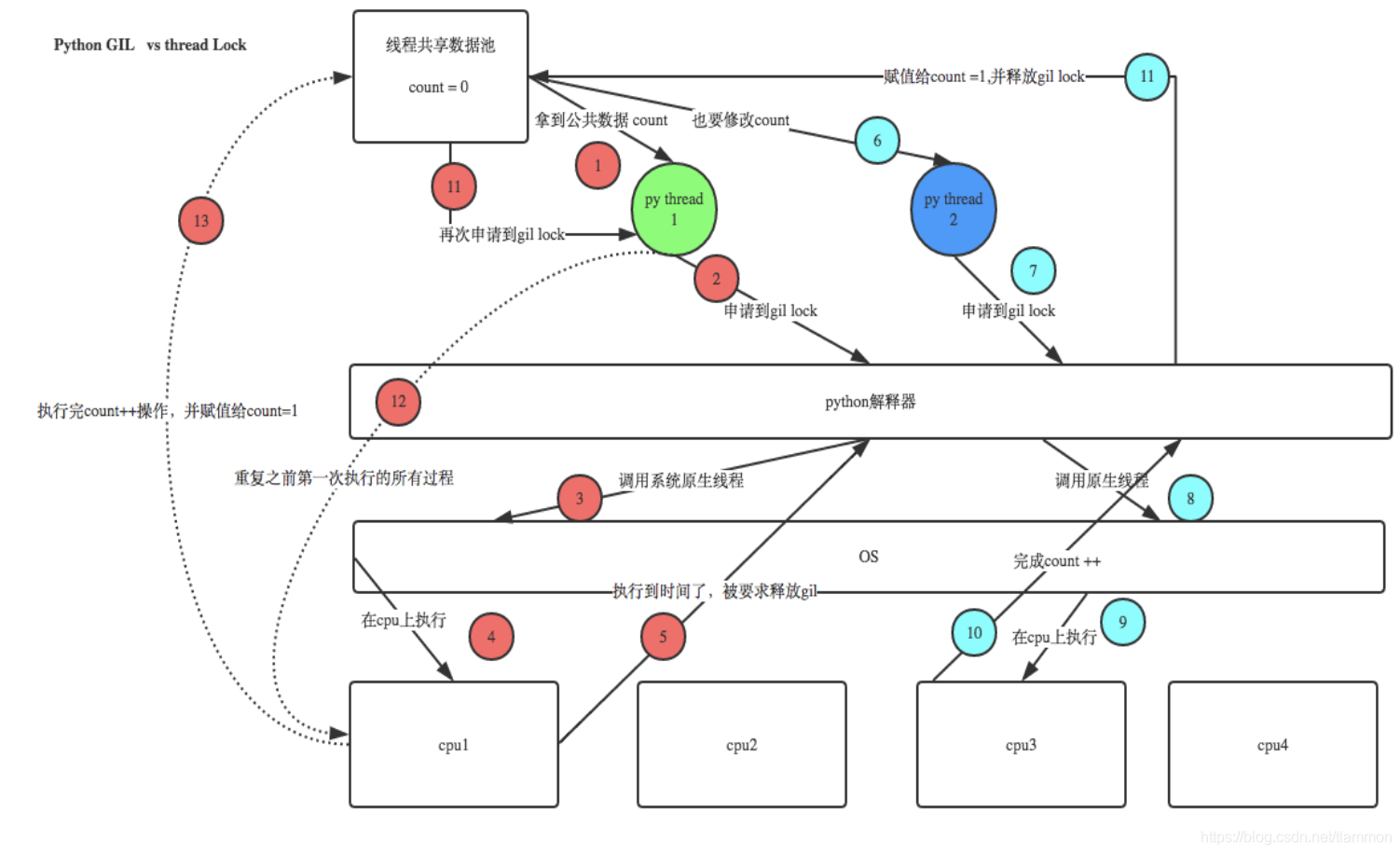 - 线程1拿到GIL锁,加载count数据,准备修改的时候,被CPU进行调度