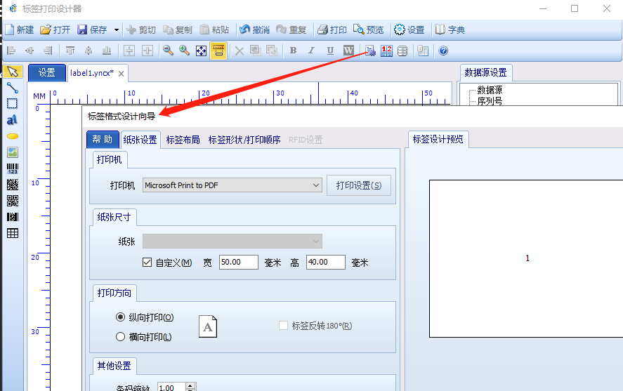 我们先编辑一个简易的模板来做说明,这里我们创建一个文本和一个QR码对象,然后对其位置进行排版,我们可以先在标签设置中来定义标签的尺寸大小: