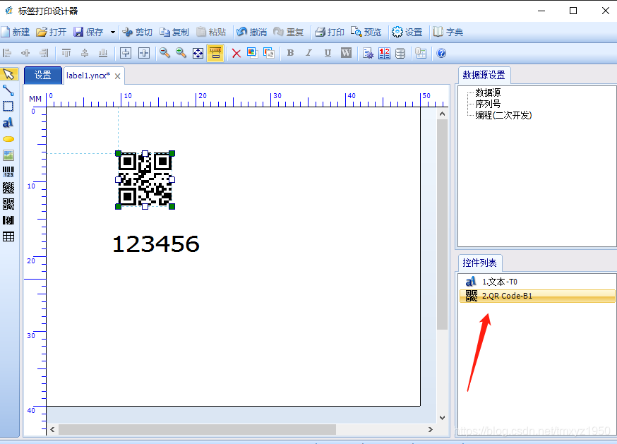值得注意的是需要记住右下角控件列表内的对象代号,在上图中我们看到箭头所指的内容,其中文本对象是使用“T0”来表示,而QR码的对象代号则是使用"B1" 来表示,这两个代号将在后面的脚本中来让数值对应替换到指定代号的位置更新。