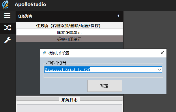 这里作为演示,我们将在脚本中输入一段固定的内容,目的是为了让我们定义好的内容做正确替换的上面我们设计好的标签模板中去,所以我们在ApolloStudio中只需简单定义2个模板:脚本模块和标签打印模块,脚本模块的作用是为了加载我们编写好的脚本路径,而标签打印模块则是指定默认打印输出的打印机名。