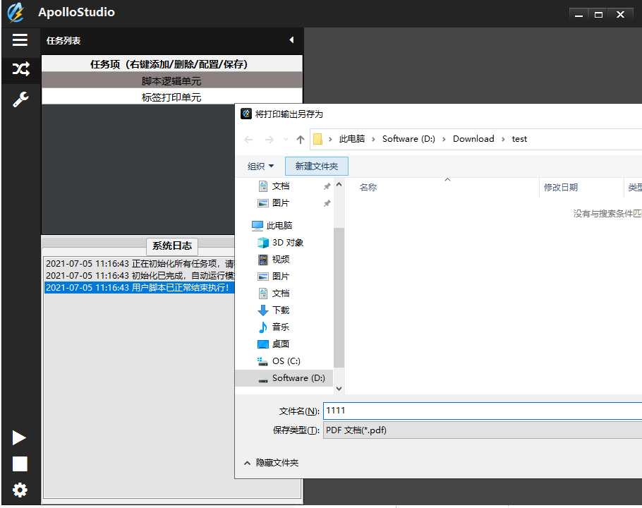 作为演示,我们在标签打印单元中设定默认可用的打印机为Windows的虚拟打印服务,可以将需要打印的内容导出为PDF格式的文件。