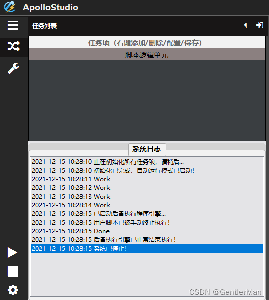编写后备代码是具有固定的函数名开头的,可以理解为ApolloStudio编译执行器在执行该段函数时,会将该函数默认提取出来作为一段新的脚本独立运行,而开始运行的时间点就在软件由运行状态切换至停止状态,或者是当软件被关闭的时候,这里我们以一段DEMO程序进行说明: