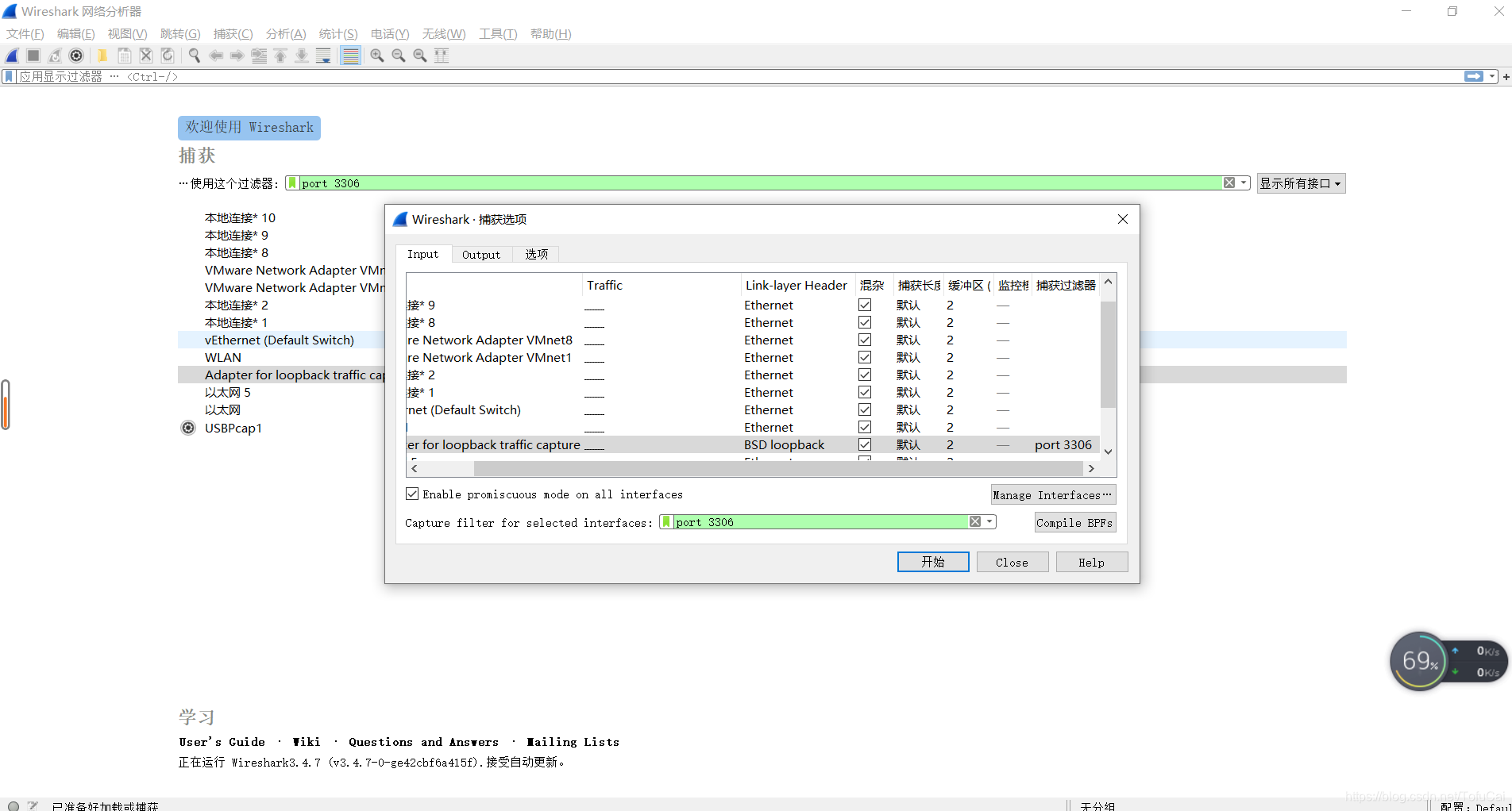 3.wireshark编辑捕获器,监听3306端口(mysql连接端口)
