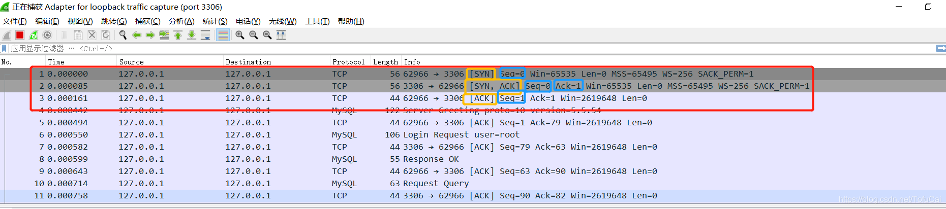 总计:三次握手双方的序列号都校验无误,故三次握手成功,建立连接,所以有了下方的No4,5,6等等的数据传输