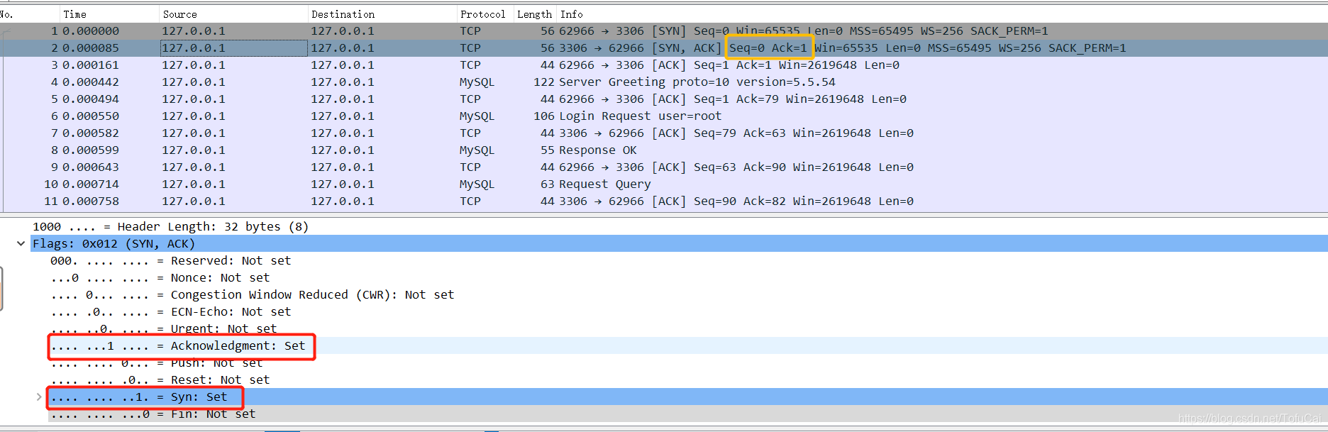 下方红色框框SYN=1 和ACK=1,说明这是第二次握手,上方黄色框为服务端生成序列号Seq=0和应答序列号Ack=1(即Ack=客户端值为0的Seq+1)。