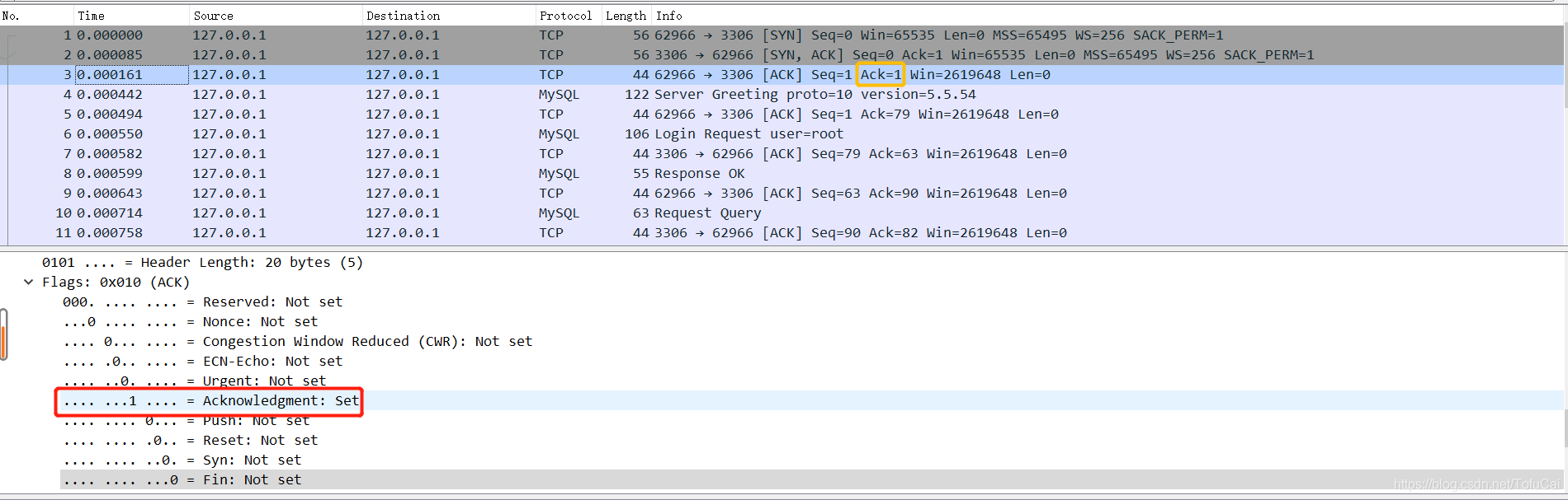 下方红色框框ACK=1,说明这是第三次握手,上方黄色框为客户端应答序列号Ack=1(即Ack=服务端生成的seq+1)。