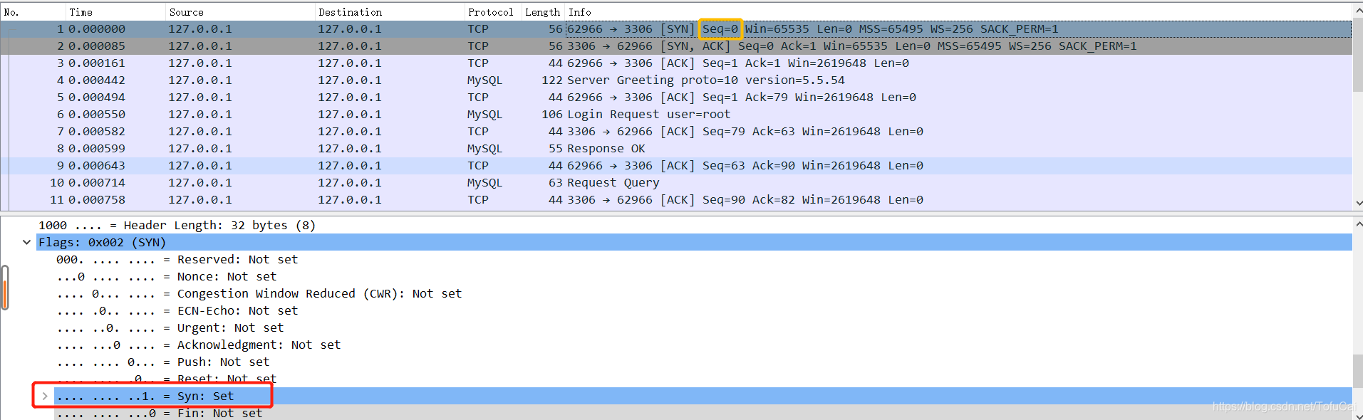 注意标志位和Seq是不是有些似曾相识,和我们上面上述的三次握手是不是有些相似?