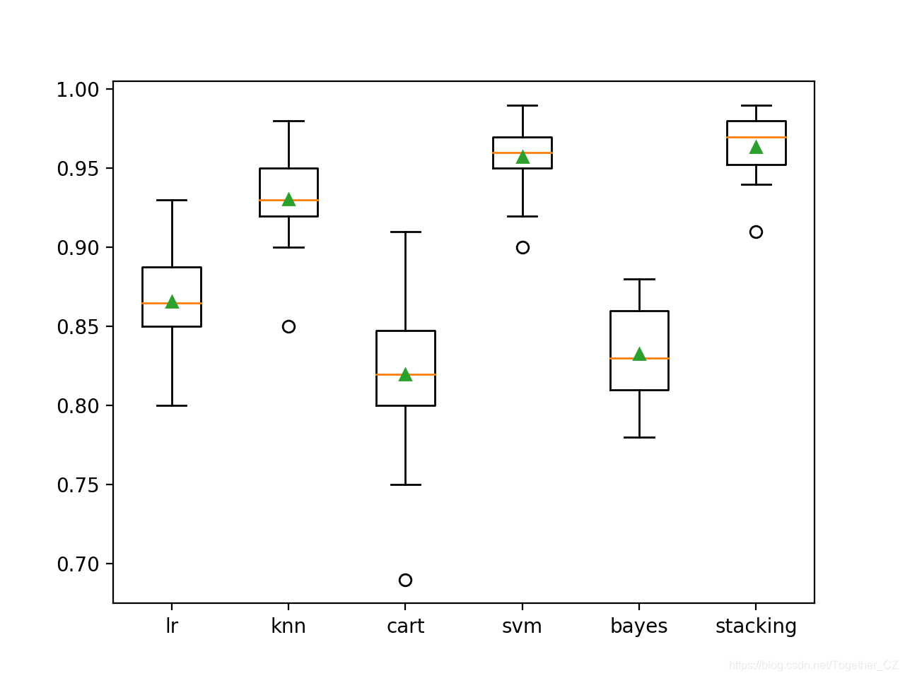 然后,我们可以报告每种算法的平均性能,还可以创建箱形图和晶须图,以比较每种算法的准确性得分的分布。 结合在一起,下面列出了完整的示例。